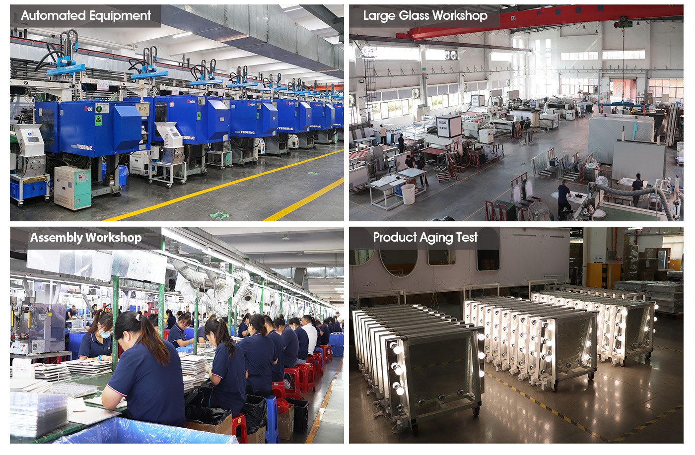 DAPAI Mirror's production workshop is a hub of excellence, boasting over 800 skilled professionals dedicated to crafting high-quality mirrors. Our facility includes specialized production areas for makeup mirrors and larger mirrors such as bathroom mirrors, mirror cabinets, Hollywood bulb mirrors, and full-length mirrors. With 10 automated production lines and 72 24-hour automatic injection molding machines, we ensure efficiency, precision, and consistency in every product we create.