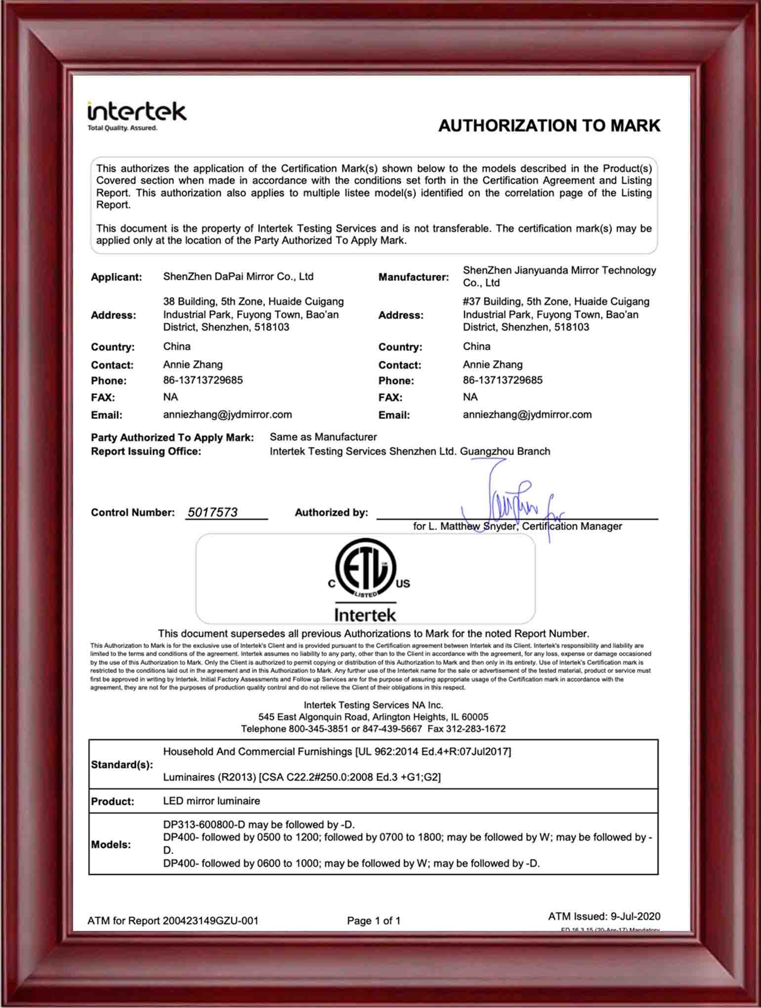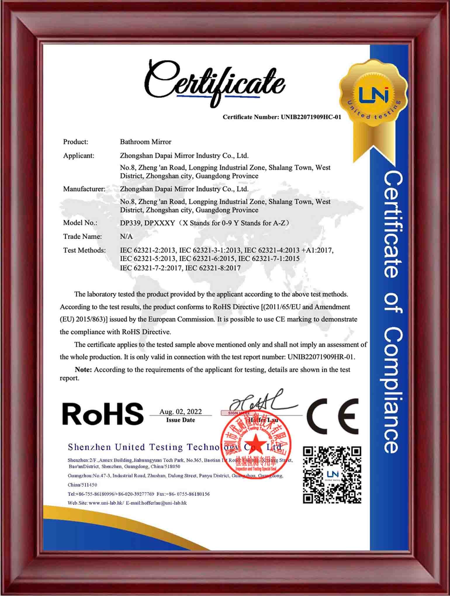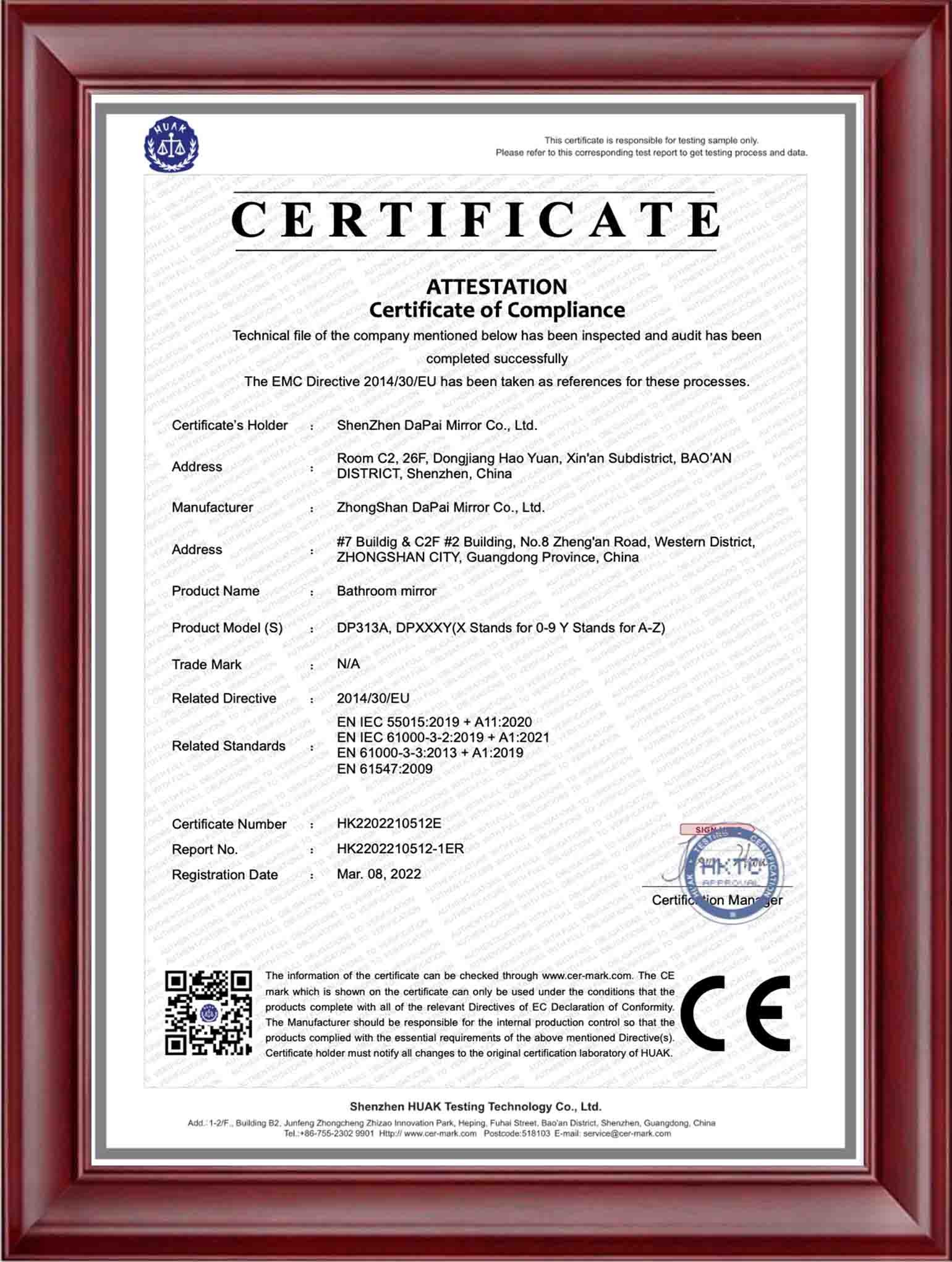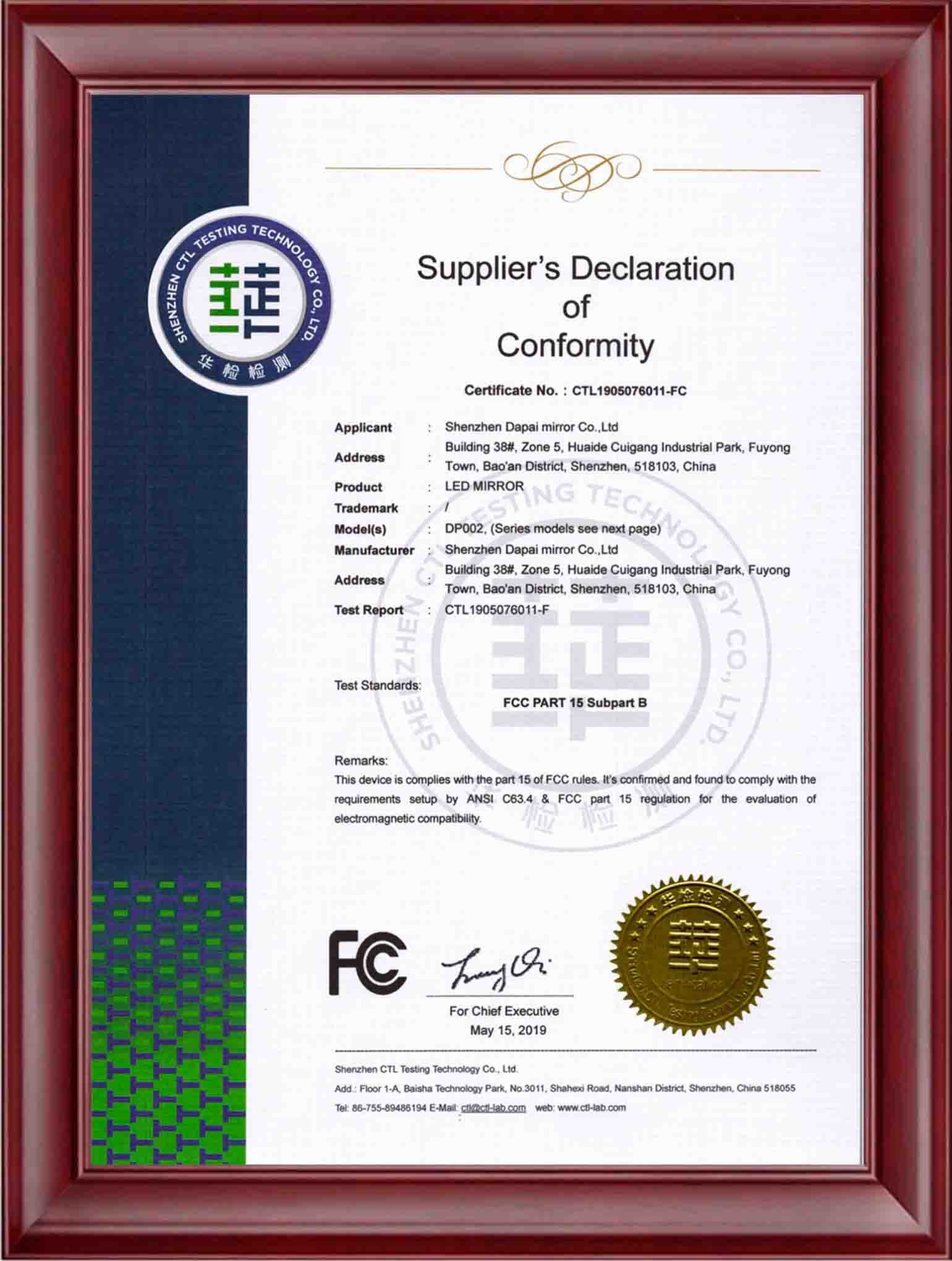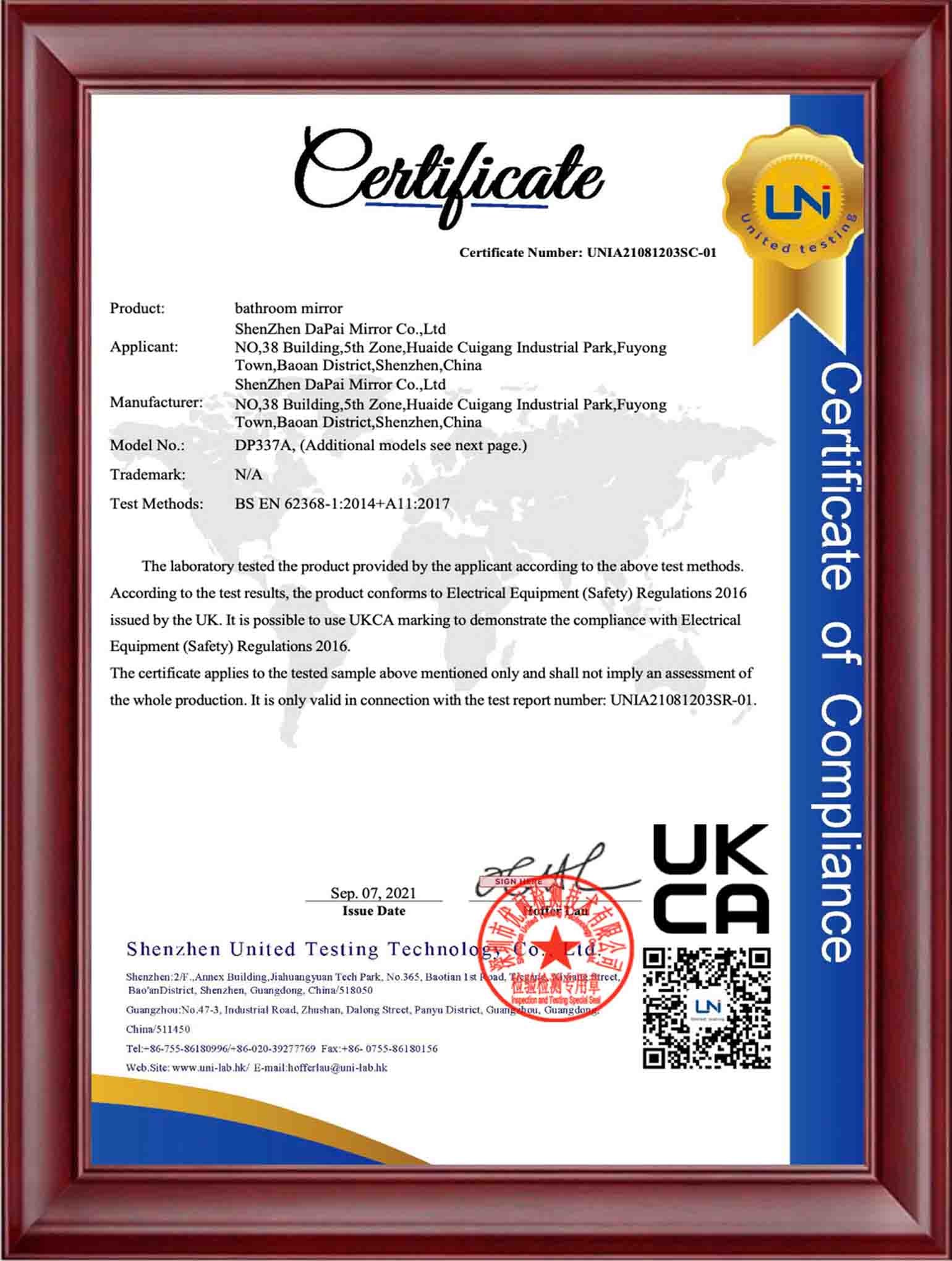 At DAPAI Mirror, we prioritize excellence in manufacturing and product safety, as evidenced by our comprehensive factory certifications, including BSCI, GSV, ISO14001, and ISO9001. These certifications highlight our dedication to responsible business practices, environmental sustainability, and consistent quality. Furthermore, our LED mirrors have earned international certifications such as UL, FCC, ETL, CE, RoHS, UKCA, and SAA, showcasing our commitment to providing products that adhere to the highest global standards for safety and performance.