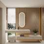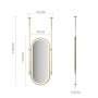 Unlike conventional wall mirrors, the DP546 features a stainless-steel ceiling suspension system that delivers a floating visual effect. Its oval silhouette enhances balance and openness in interior design, while the golden stainless-steel frame adds a touch of luxury and durability. This design provides both functionality and sophistication, making it a centerpiece in high-end bathroom interiors.