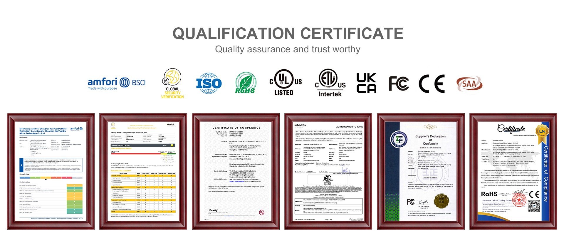 Mirrors passed UL, ETL, CE, FCC, ROHS, UKCA, certificate.